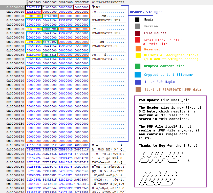 データ自体の解析結果は以下のようになっています。ヘッダーサイズは512バイト固定で、コンテナの中には10個までPUPファイルを格納しておけるようになっています。今までのソニーのアップデータ形式であるPUPと拡張子こそ同じものの、内部に実際のPUPファイルを含むんでいる形式に変わったことになります。
