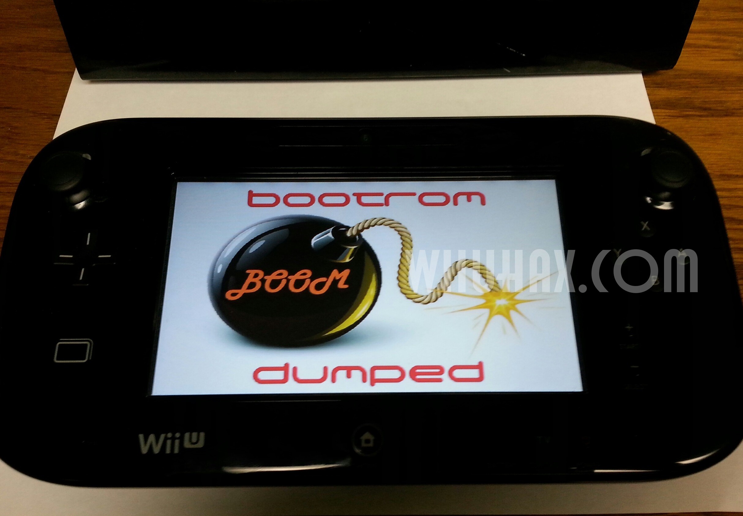 Wii U GamePadに「BootROMをダンプしたよ」ということをアピールする画像を表示した写真が掲載されています。これがexploitを利用した成果なのか単なるイメージカットなのかが問題です。