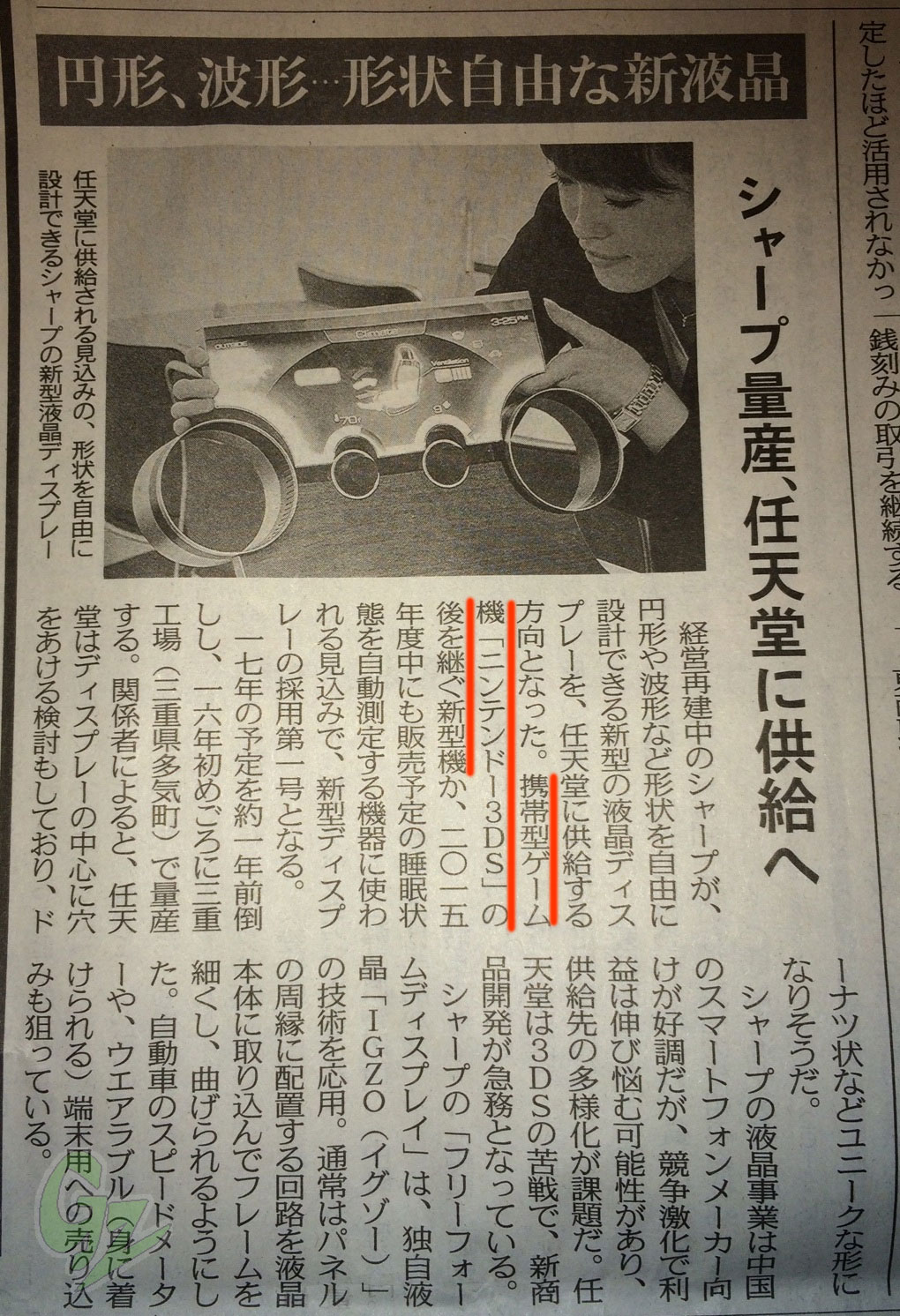 今朝の中日新聞(中部地方のブロック紙: 関東では東京新聞)朝刊に、シャープが形状を自由に設計できる「フリーフォームディスプレイ」を任天堂に供給すると伝えていました。ニンテンドー3DSの後継機か、2015年中にも販売予定の睡眠状態を自動測定する機器に使われる見込みです。